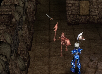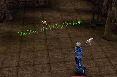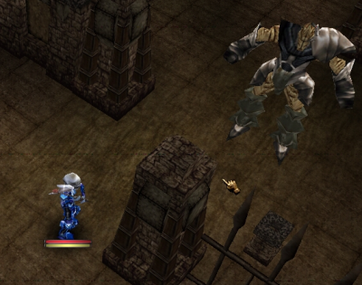 よぉし、後は階段まで一直線に……あうぅ、こいつがいたかぁ。 「オマエ、ケハイ、チガウ。オレ、ツウロ、ミハルシゴト。」 いえ、その、あの、さいならぁ。 |