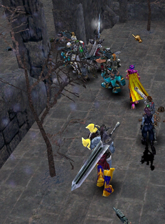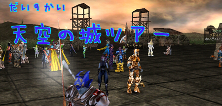 集合時間になりました。移動装置の周りは人であふれています。 周りの人を見ると、おっきな剣を背負ってたり、きれいなマントをしてたり、 強そうな人ばっかりです。ついていけるかしら。 |